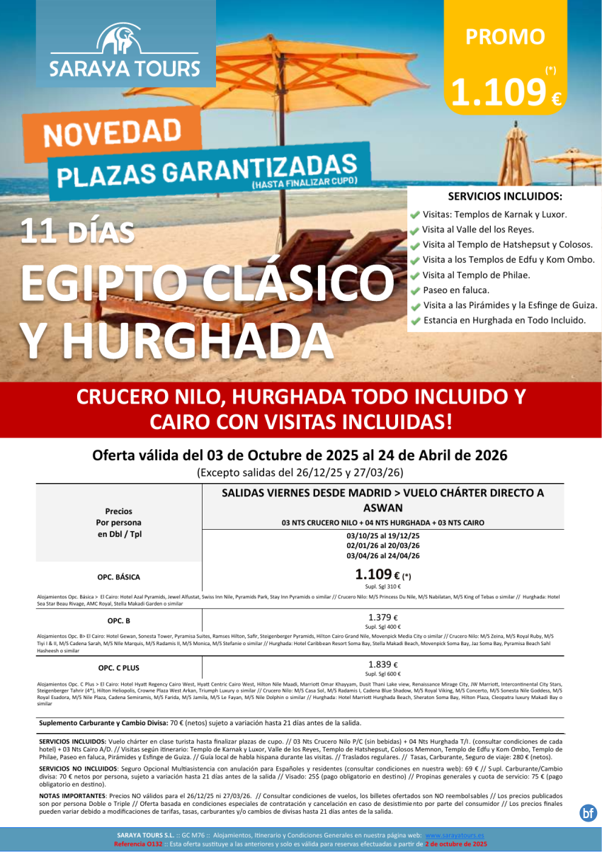 Egipto Clásico y Hurghada 11 d -Vuelo Charter Madrid - 3 Crucero Nilo +4 Hurghada + 3 Cairo. Hasta Abril26