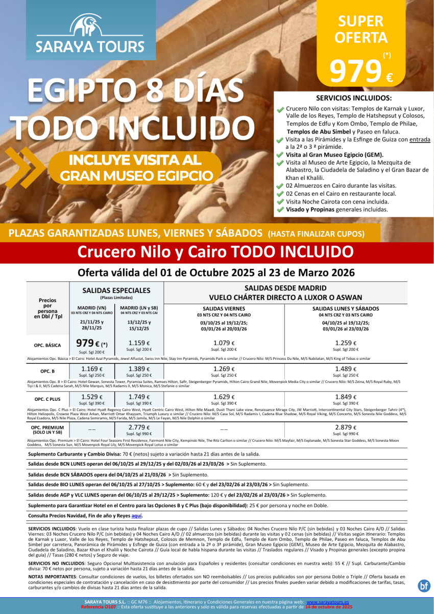 Egipto Todo Incluido 8d. *Salidas Mad,Bcn,Bio,Agp,Vlc* Crucero y Cairo+ visitas, Propinas y Visado. Desde 929€